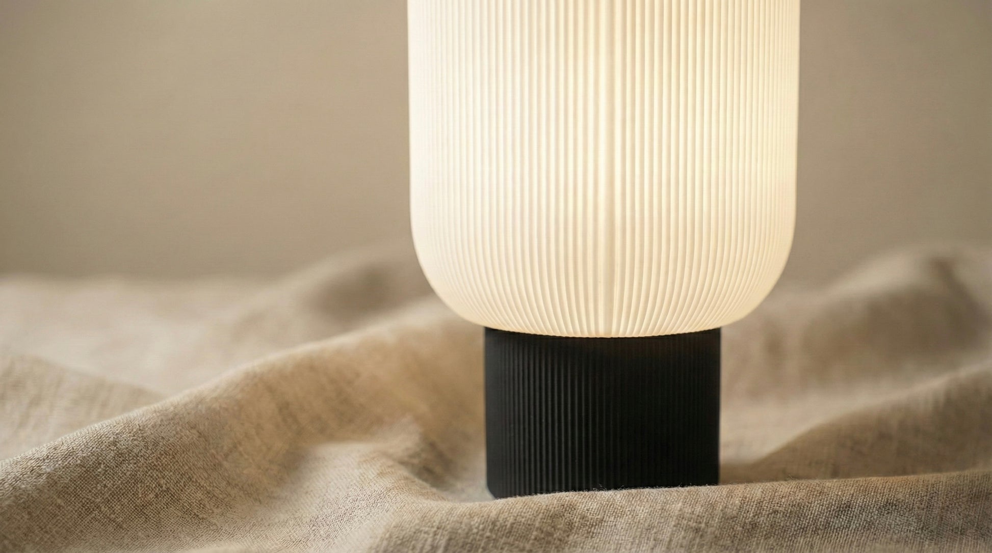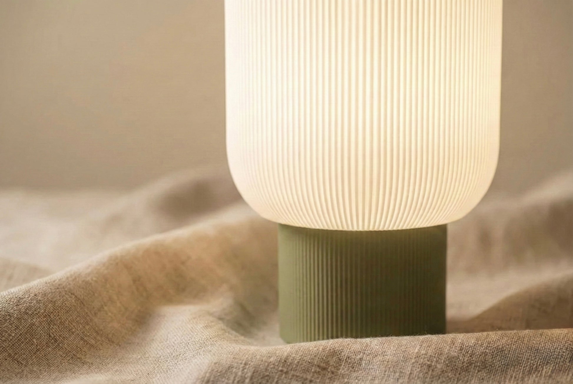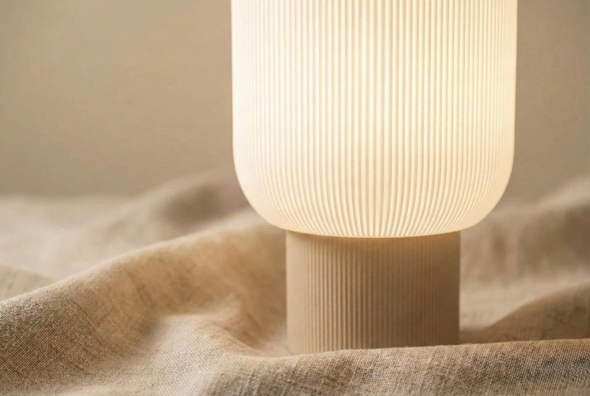 Fabricada en Chillán mediante impresión 3D de alta precisión, cada pieza toma más de 8 horas en materializarse capa por capa, creando una textura estriada única al tacto que juega con la luz incluso cuando está apagada.
